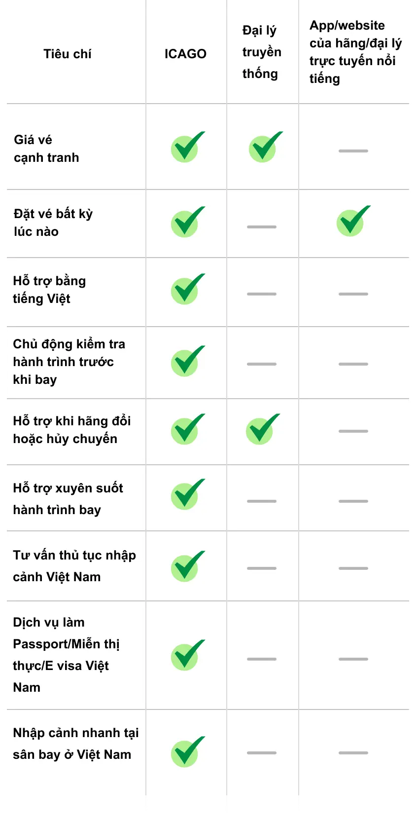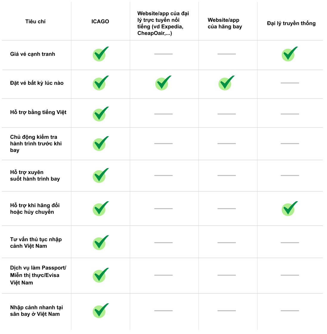 ICAGO giúp bạn tìm vé giá tốt, hành trình phù hợp, tư vấn bằng tiếng Việt và hỗ trợ xuyên suốt, mang lại sự an tâm và thuận tiện trong chuyến bay. Chúng tôi cũng cung cấp nhiều dịch vụ hữu ích cho khách hàng bay là người Việt tại Mỹ như làm Passport, visa Việt Nam và đón bạn nhập cảnh nhanh tại sân bay khi về Việt Nam.